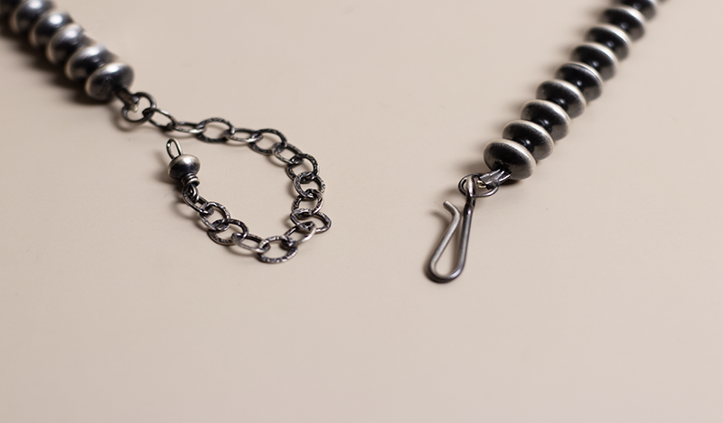 This necklace is handcrafted by a Navajo Artist, out of sterling silver. This bead set is made up of graduated saucer beads that add interest to any outfit. The length is longer and these beads layer beautifully with a shorter set or additional necklaces of the same length. These beads are a meaningful addition to any wardrobe and can be styled up or down with any of our other pure sterling silver pieces.