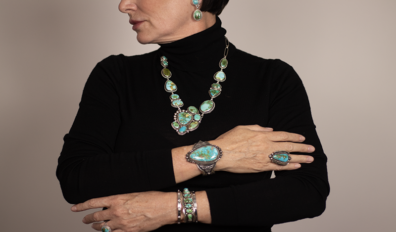 This handcrafted cuff by Navajo Artist, Albert Jake is one of a pair of "his and hers." This cuff favors a female wrist with a rounded lace like edge and teardrop center stone. This cuff is set with Sonoran Gold turquoise and features handstamping down each side making it a certified show stopper. Buy it as a gift for the collector in your life, or keep it for yourself.