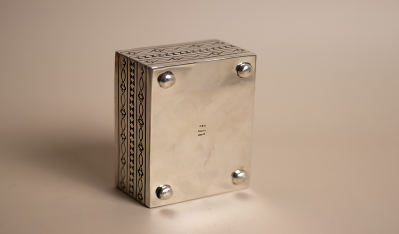 Rare Solid Sterling Silver treasure box with detailed handstamping by the talented Navajo Artist, Albert Jake. The Sonoran Blue Turquoise is 75 carats, making this not only a treasured find, but a once in a lifetime collectors piece. In nearly 100 years of trading this is the largest and most detailed treasure box we have had in our collection.