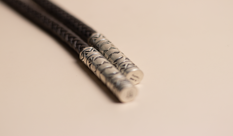 This bolo tie is handcrafted by a Navajo Artist at HBH "Heavy By Hand", out of sterling silver and Kingman Turquoise, and set on a brown leather cord and custom hand stamped sterling silver tips. This piece is a meaningful addition to any wardrobe and can be styled up or down with any sterling silver or Kingman pieces.