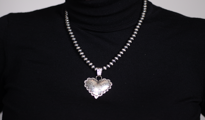 This sweet bubble heart shaped pendant has a unique scalloped edge with detailed handstamping throughout. The bail is large enough to accommodate up to a 8mm chain. This piece is Navajo handcrafted from our pawn collection and comes with its original red pawn ticket.