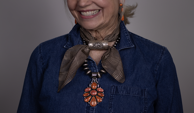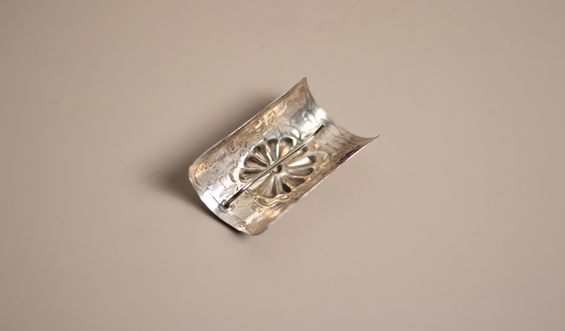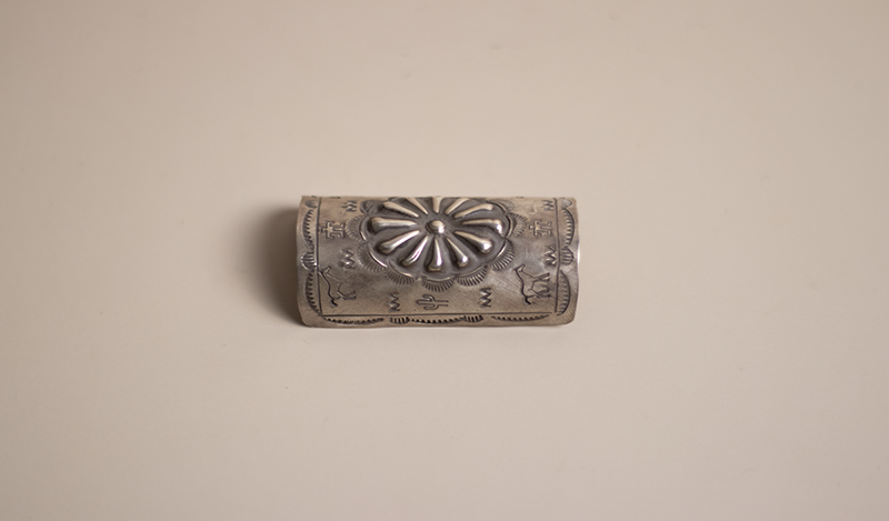 This is a traditional pony tail ornament with a long Shepards hook to fasten it in any hairstyle. The ring features tiny horses, thunderbirds, and cacti and a center concho design. Although it was originally designed to be worn in your hair, we love to use these as scarf ties. This piece was handcrafted out of sterling silver by a Navajo artist.