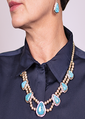 This necklace and earring set is handcrafted by Eugene Belone, out of sterling silver and Kingman Water Web Turquoise, and is set on traditional silver beads. With matching earrings, this piece is a meaningful addition to any wardrobe and can be styled up or down with any of our pure sterling silver or turquoise pieces.