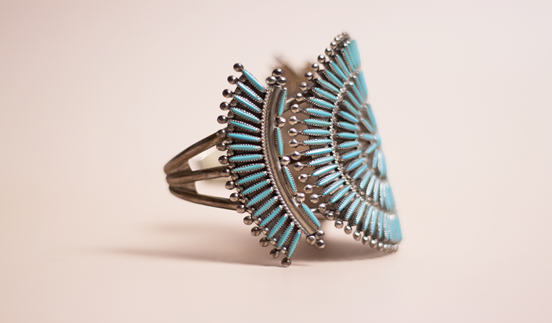 This bracelet is handcrafted by Zuni Artists Lance and Cordelia Waatsa in the 1970's. This piece is made out of sterling silver and turquoise. The side of the cuff is designed with smaller needlepoint cluster details. The cuff is a staple piece to any Native American jewelry collection or makes a statement of its own.