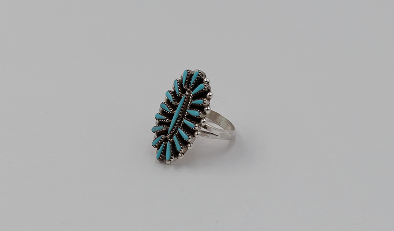 This traditional Turquoise needlepoint ring is so approachable. The size is small and understated however is noticable when worn. This is a great staple and addition to any collection. Zuni handcrafted.