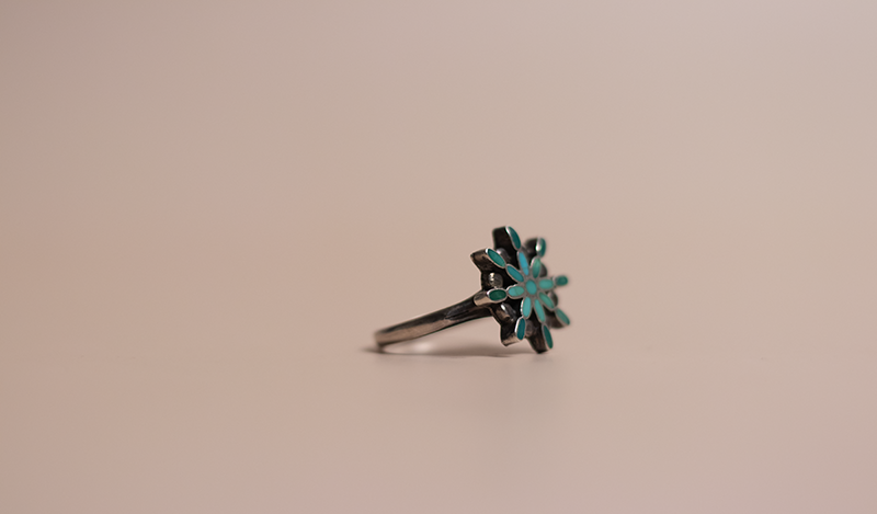 This vintage 1970's ring is handcrafted by a Zuni artist, out of sterling silver and genuine turquoise. The shank of the ring is designed with a simple yet elegant thin band. This ring is a sleek everyday piece that would fit perfectly in with any wardrobe or style to add a little color.