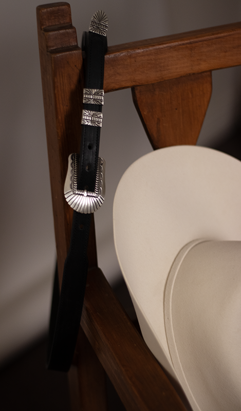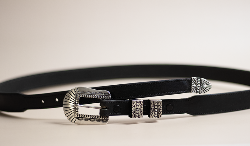 This traditional ranger buckle is handmade by Navajo Artist, Daniel Reeves. The buckle flaunts traditional handstamping with matching tip and keepers. The Reeves family is world renowned for it's handstamping work. This buckle is meant to be worn everyday.
