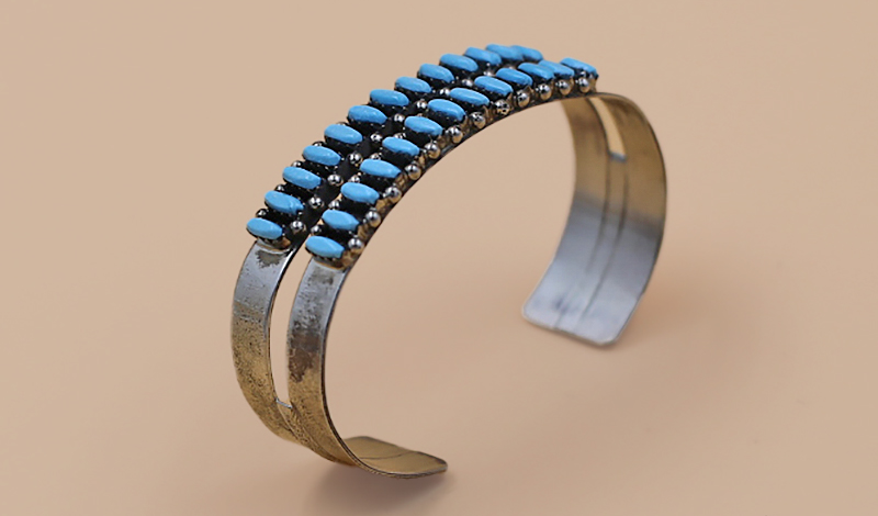 This vintage Zuni cuff is a rare double row crafted in a traditional petit point design on a simple silver band. We believe this cuff is from the late 1960's and is a staple for any collector.