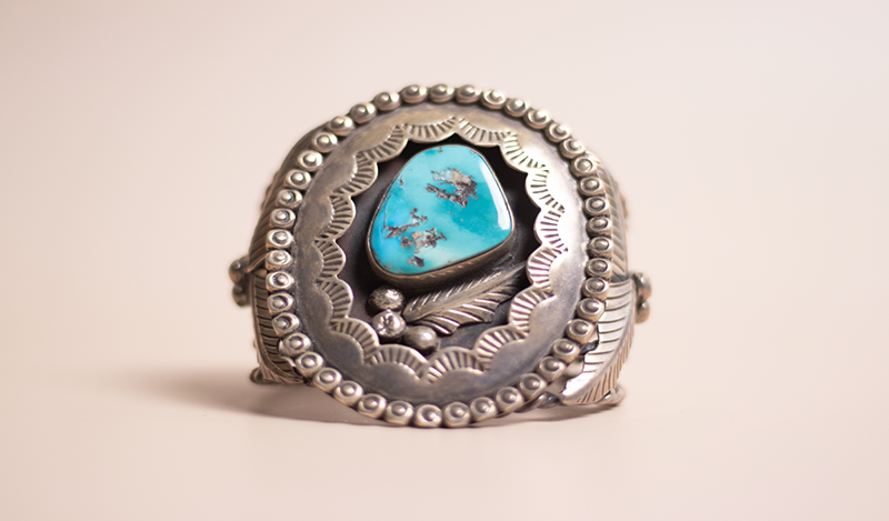 This Vintage 1970's bracelet is handcrafted by Navajo Artist Lloyd Oliver, out of sterling silver and turquoise. The side of the cuff is designed with traditional leaf details. This rare find is a fantastic addition to any Native American jewelry collection.