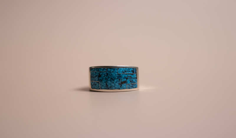This ring is handcrafted by GL Miller, out of sterling silver and Kingman Water Web Turquoise. The shank of the ring is uniquely designed in a square shape which allows for a very comfortable fit. This ring is a memorable statement piece that will catch someone’s eye with every wear while still being sleek enough for everyday wear that would fit perfectly in with any wardrobe or style.